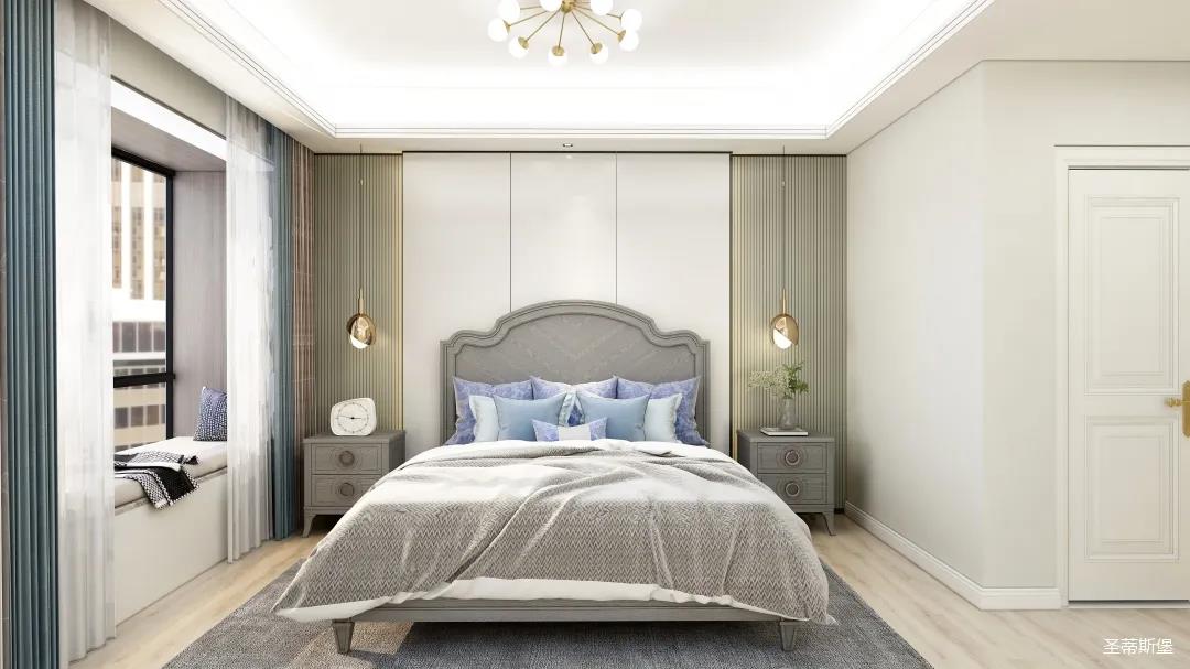 次卧的设计充满治愈气息,表姐打算让两位老人居住。莫兰迪灰的实木感经典再现,沉稳中透着时尚,流露出精致的美式格调。舍弃刻意繁复的设计,简约米白背景墙与床屏产生的视觉延伸,提升了空间的舒展性。金属材质的灯饰,以较强的白炽灯为主,辅助照明,将对两位老人的关爱体现在细节中。